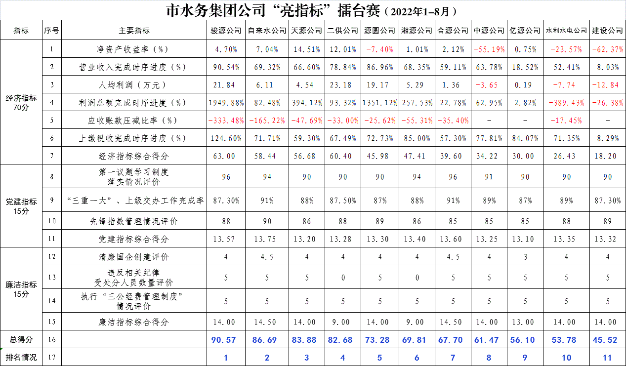 “三整頓、兩提升”,奮起二次創(chuàng)業(yè)——市水務(wù)集團(tuán)公司“亮指標(biāo)”擂臺(tái)賽(2022年1-8月)